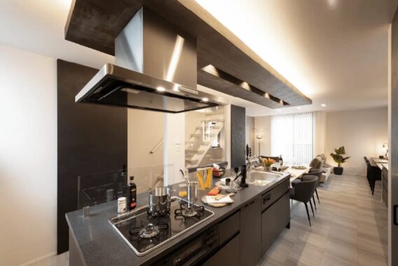 開放感と高級感を演出。·キッチンの下がり天井と玄関框下に