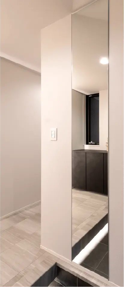 お出かけ前の身だしなみチェックができるよう床から天井までの大きなミラーを設置。 空間に奥行きを与え広く見せる効果もあります。