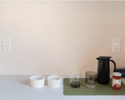 システムキッチン袖側に2口コンセントを設置することでホットプレートなどの調理器具の使いやすさを考慮しました。 ※プランにより装備していない場合があります。