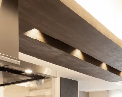 間接照明とダウンライトを効果的に配置し、落ち着きと上質感のあるリビング空間を演出。 アクセントウォールが空間に奥行きを与え、インテリアを引き立てます。 大開口からの採光により、明るさと開放感を確保し、ダイニングまで一体感のあるリビングが実現。
