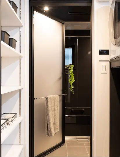 バスタオル掛けを設置した片開き戸を採用。 ゴムパッキンやドア下部の換気口がなくお手入れが簡単。