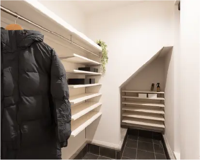 大容量の収納を叶えるシューズインクロゼット(又は玄関収納)。 床から天井まで壁一面に設置し、家族全員の靴はもちろんベビーカーや趣味の道具まですっきり収納できます。 ※プランによります。