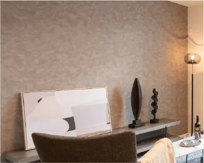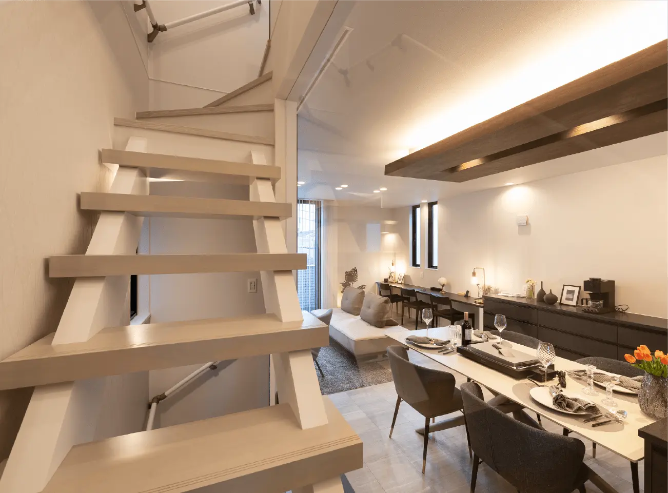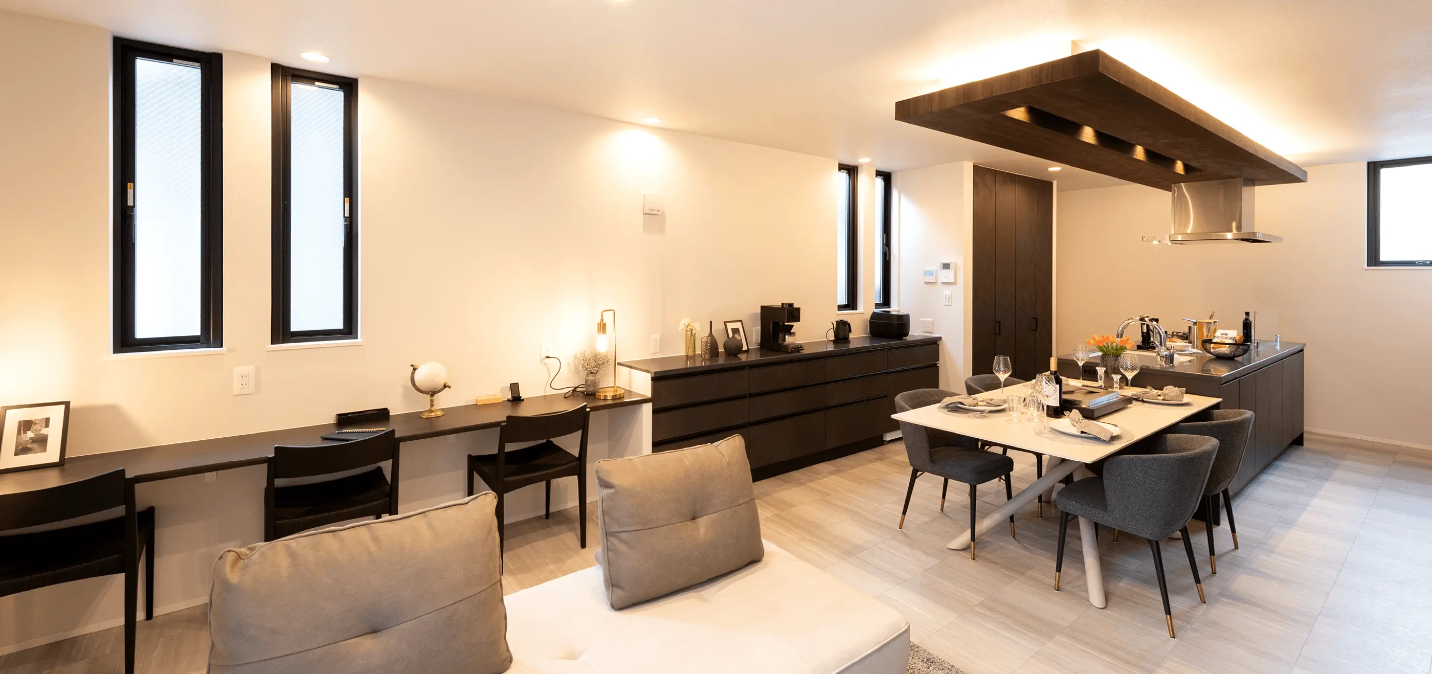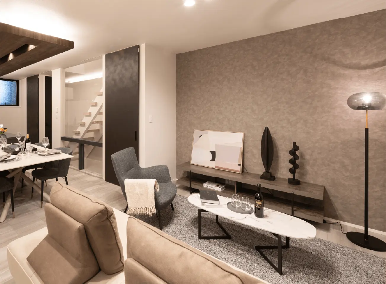 間接照明とダウンライトを効果的に配置し、落ち着きと上質感のあるリビング空間を演出。 アクセントウォールが空間に奥行きを与え、インテリアを引き立てます。 大開口からの採光により、明るさと開放感を確保し、ダイニングまで一体感のあるリビングが実現。