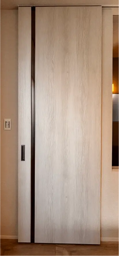 ドアやクロゼットなど全ての建具の高さが天井まであるので、空間の連続性を感じさせることにより、室内の空間をより広く開放的に演出することができます。 また、引戸の取っ手をなくすことでスッキリとし、行き来の邪魔にもなりません。