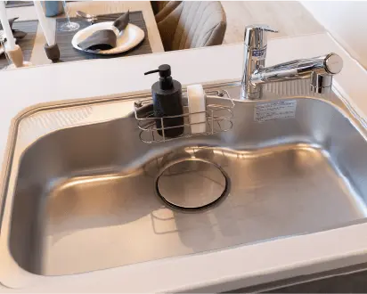 シンク裏を吸音材で覆う事で水はね音などを大幅に低減。 リビングでくつろぐ家族にも配慮した静音シンク。