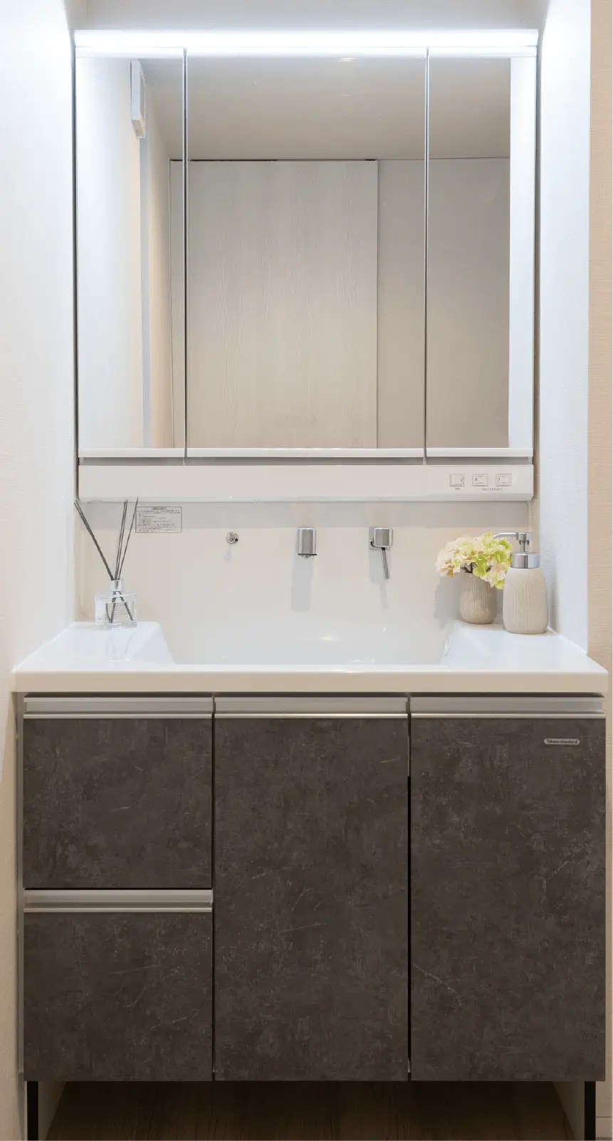 浴室をより広く見せるワイドミラーはゆとりあるくつろぎの時間を演出します。