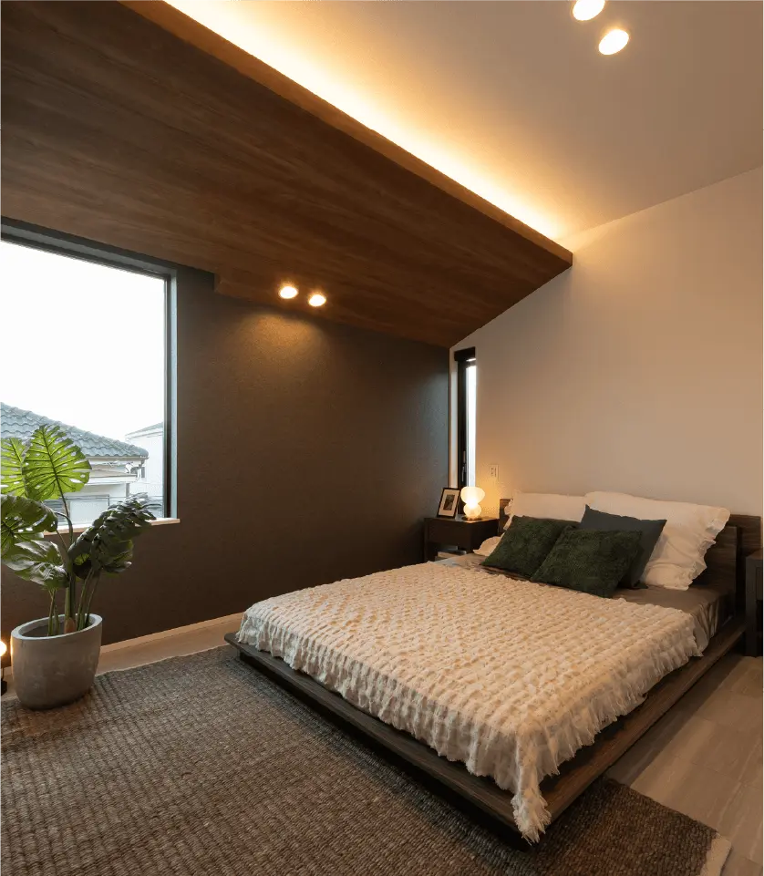 空間にアクセントを与え上質さを演出する下がり天井に、陰影が印象的な間接照明を採用しました。